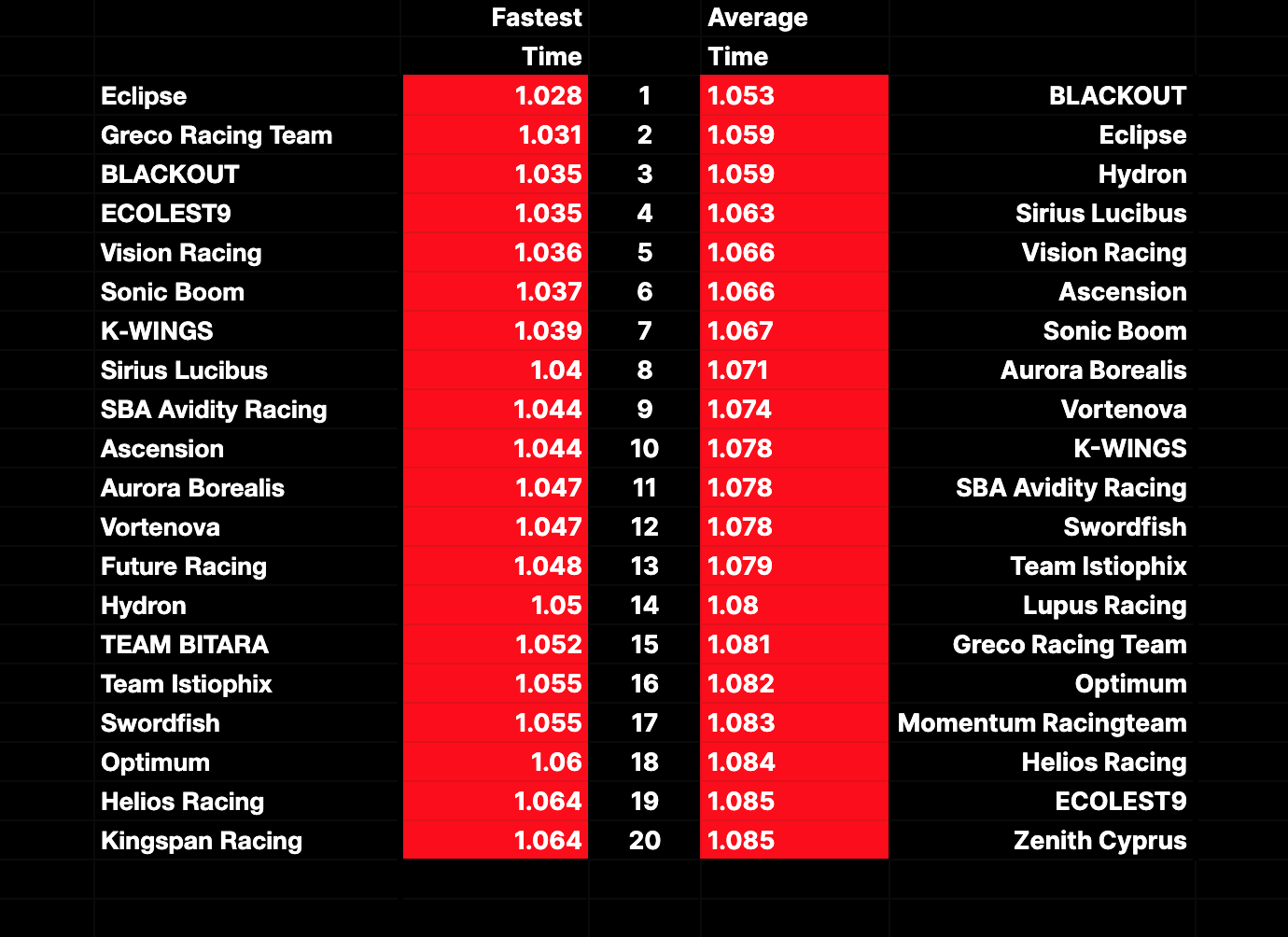 We see BLACKOUT jumping up from third to first when looking at average times. Eclipse still stay strong in second place and get a new for this year bonus 10 points for the single fastest time. More significantly we see Hydron moving up from 14th to third. But as Hydron slide up, Greco Racing Team slide from second to 15th.